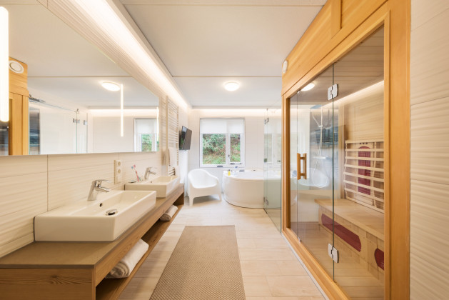• Royale badkamer met bubbelbad, sauna en aparte inloopdouche en separaat toilet